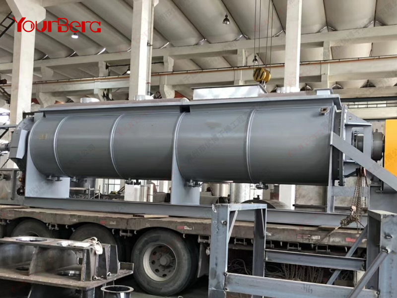 空心軸上密集排列著楔型中空漿葉,熱介質(zhì)經(jīng)空心軸流經(jīng)漿葉。單位有效容積內(nèi)傳熱面積很大,熱介質(zhì)溫度從-40℃到320℃,可以是水蒸汽,也可以是液體型:如熱水、導(dǎo)熱油等。間接傳導(dǎo)加熱,沒有攜帶空氣帶走熱量,熱量均用來加熱物料。熱量損失僅為通過器體保溫層向環(huán)境的散熱。楔型漿葉傳熱面具有自清潔功能。物料顆粒與楔型面的相對運(yùn)動(dòng)產(chǎn)生洗刷作用,能夠洗刷掉楔型面上附著物料,使運(yùn)轉(zhuǎn)中一直保持著清潔的傳熱面。漿葉干燥機(jī)的殼體為Ω型,殼體內(nèi)一般安排二到四根空心攪拌軸。殼體有密封端蓋與上蓋,防止物料粉塵外泄而充分發(fā)揮作用。