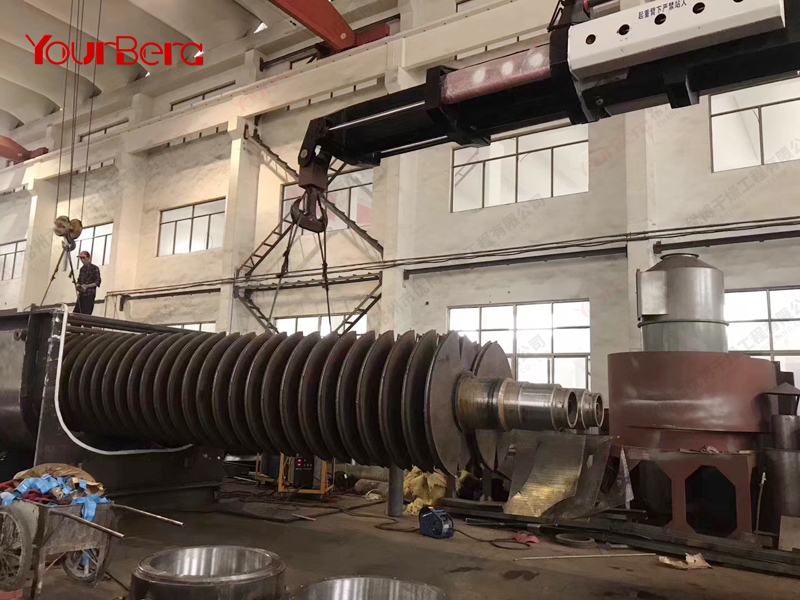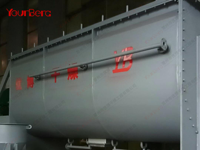 空心軸上密集排列著楔型中空漿葉,熱介質(zhì)經(jīng)空心軸流經(jīng)漿葉。單位有效容積內(nèi)傳熱面積很大,熱介質(zhì)溫度從-40℃到320℃,可以是水蒸汽,也可以是液體型:如熱水、導(dǎo)熱油等。間接傳導(dǎo)加熱,沒有攜帶空氣帶走熱量,熱量均用來加熱物料。熱量損失僅為通過器體保溫層向環(huán)境的散熱。楔型漿葉傳熱面具有自清潔功能。物料顆粒與楔型面的相對運動產(chǎn)生洗刷作用,能夠洗刷掉楔型面上附著物料,使運轉(zhuǎn)中一直保持著清潔的傳熱面。漿葉干燥機(jī)的殼體為Ω型,殼體內(nèi)一般安排二到四根空心攪拌軸。殼體有密封端蓋與上蓋,防止物料粉塵外泄而充分發(fā)揮作用。