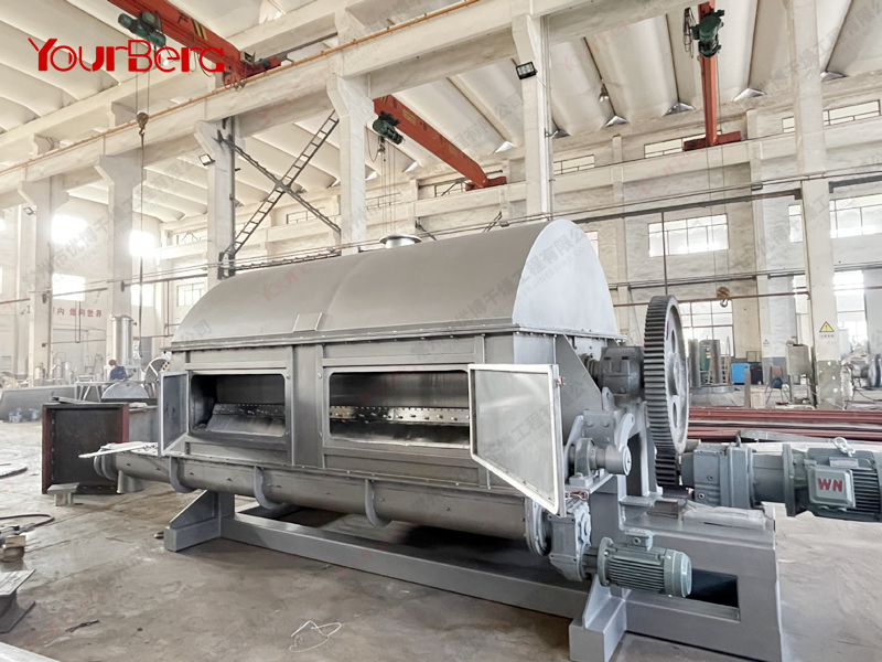 滾筒刮板干燥機(jī)是一種內(nèi)加熱傳導(dǎo)型轉(zhuǎn)動連續(xù)干燥設(shè)備。旋轉(zhuǎn)的滾筒通過其下部料槽,粘附著一厚度的料膜,熱量通過管道輸送至滾筒內(nèi)壁,傳導(dǎo)到滾筒外壁,再傳導(dǎo)給料膜,使料膜中的濕得到蒸發(fā)、脫濕、使含濕分的物料得到干燥。干燥好的物料被裝置在滾筒表面的刮刀鏟離滾筒,到置于刮刀下方的螺旋輸送器,通過螺旋輸送器將干物料集中、包裝。