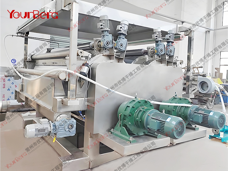 3、啟動電機,主滾筒動運轉平穩(wěn),溫度升高后加入物料后調整電機轉速及物料在滾筒上薄膜均勻程度來控制物料終含水量。
