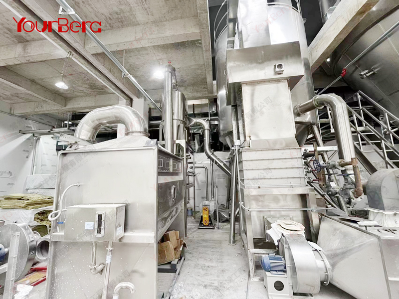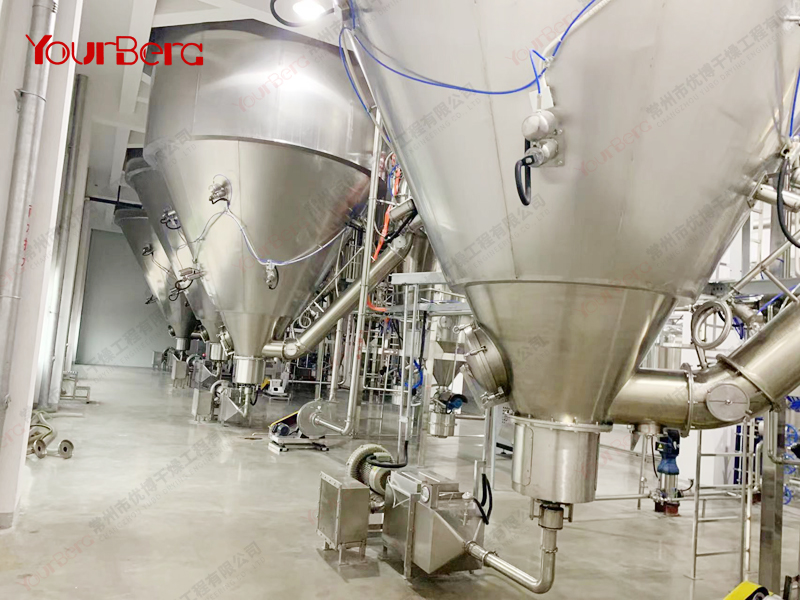 空氣經空氣過濾器后進入空氣加熱器,當空氣加熱器到給定的溫度后以切線方向進入熱風分配器,經熱風分配器作用后的空氣,均勻地、螺旋式地進入干燥室,同時料液由霧化器霧化為20~60um的霧滴,當霧滴與熱空氣接觸后就迅速汽化干燥為粉末或顆粒產品。采用旋風風離器直接收集后經氣力輸送至效料倉,完成物料的冷卻及輸送,廢氣由風機排出口經水沫除塵器排出。