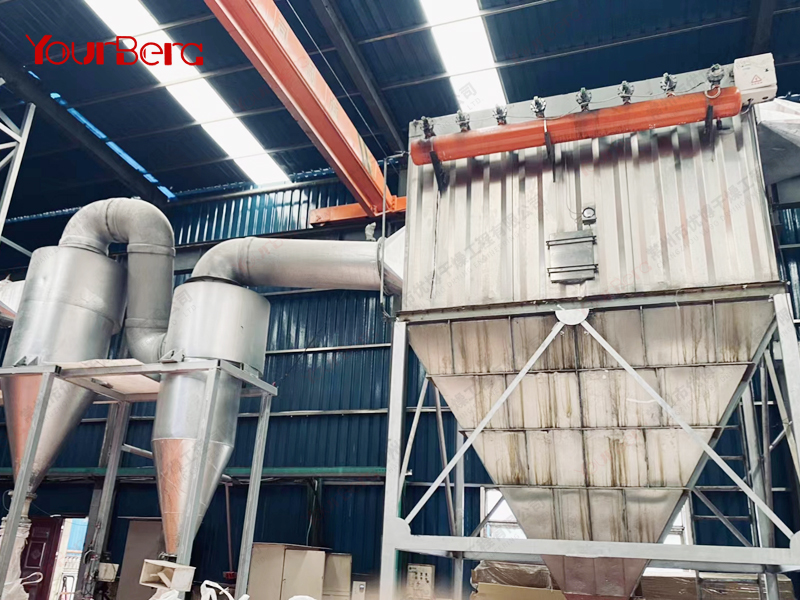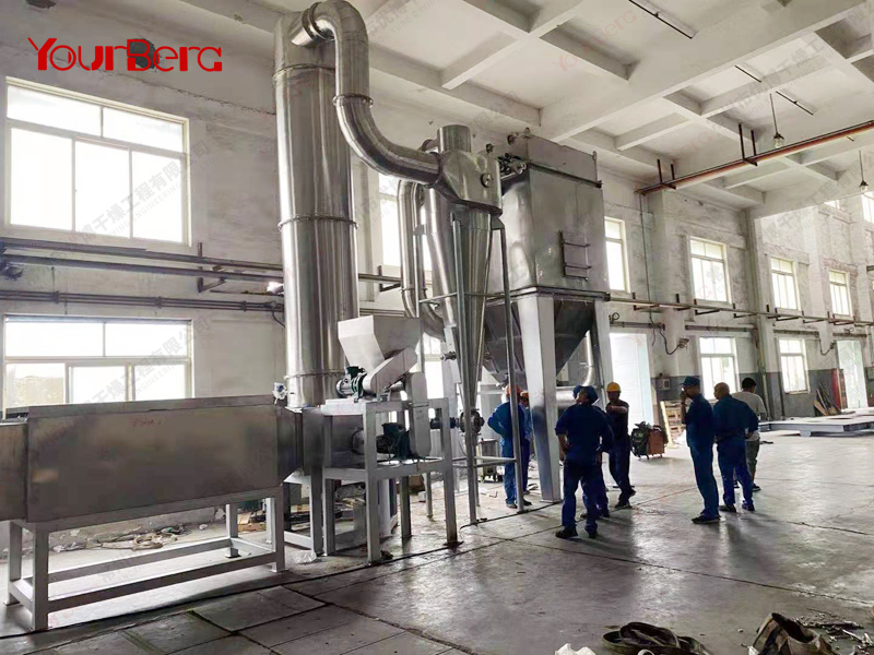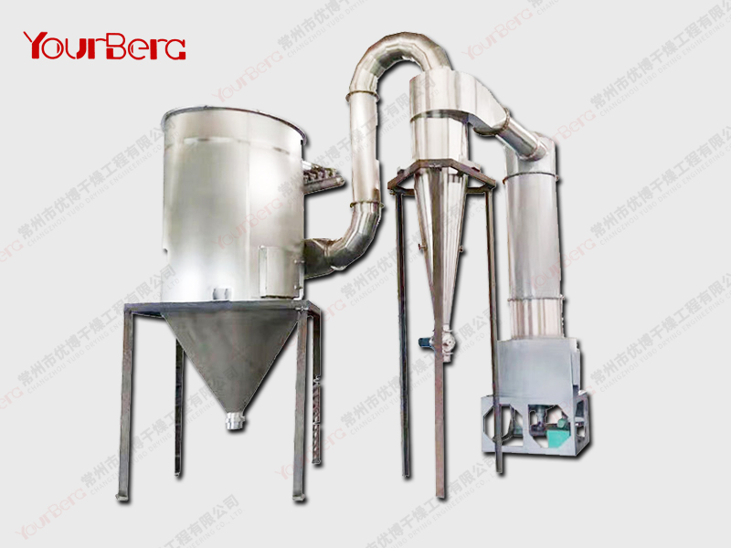 粒度分級:在干燥主機(jī)的上部設(shè)置環(huán)形擋板,此被稱為閃蒸干燥機(jī)分級器。當(dāng)物料運(yùn)動經(jīng)過該分級器時變會受到離心力的作用,呈現(xiàn)不同旋轉(zhuǎn)半徑螺旋上升的趨勢。粒徑較小的物料從分級器的內(nèi)孔排出;顆粒較大的物料被留在干燥室內(nèi)繼續(xù)粉碎,待達(dá)到標(biāo)準(zhǔn)粒度從內(nèi)孔排出。