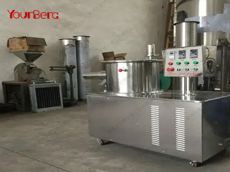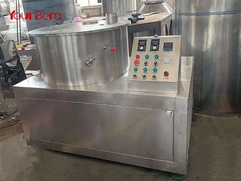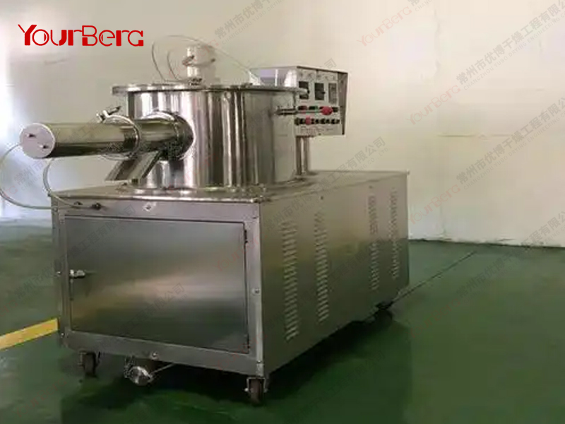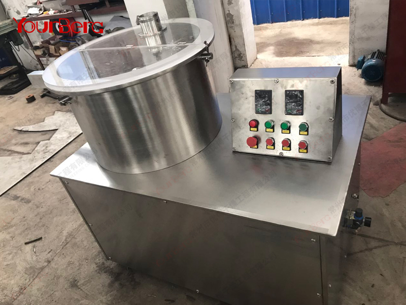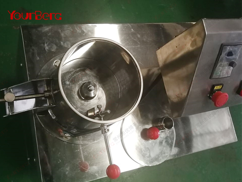 本機是通過設置旋轉離心盤、鼓風機、氣動噴槍,將濕顆粒制成美麗的球丸。將前道工序做成的濕顆粒投入旋轉離心盤內,啟動鼓風機后再將旋轉離心盤啟動,使?jié)耦w粒受到環(huán)隙空氣浮力、旋轉離心力、自身重力作用,呈環(huán)周繩股狀運動,從而形成真球度極高的球丸。